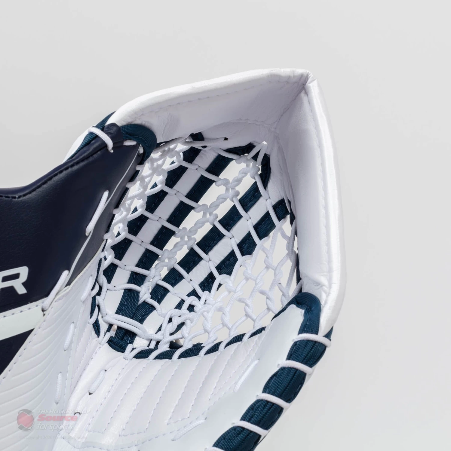 The Bauer Supreme 3S INT Catcher will be available in the following colorways: all White, White/Black, White/Navy, White/Blue, and White/Red. The 3S Goalie Glove is available in Regular hand (worn on your left hand) in all colourways, and Full Right (worn on your right hand) in All White.