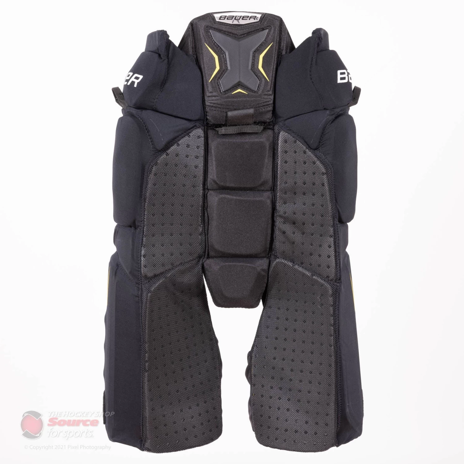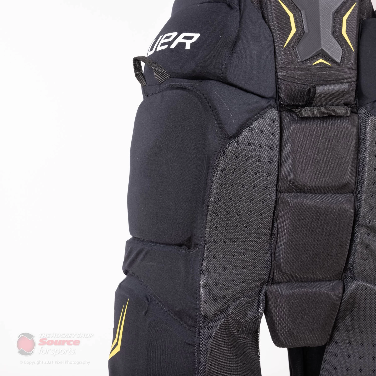 The Bauer Supreme ACP Elite uses an integrated spine protection piece. This merged section allows the spine protection to stay locked and secure to your body. It is also equipped with additional high-density foam to further protect the spinal region.
