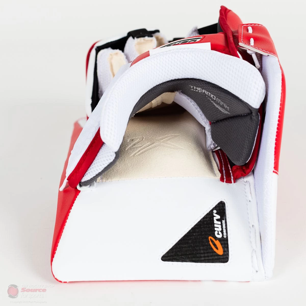 The hand protection is great on this blocker, with finger protection and large thumb protection, ensuring nothing gets to your palm or fingers. The side board also has a tapered area that will hug the stick, preventing puck from riding up your stick and hitting your fingers.