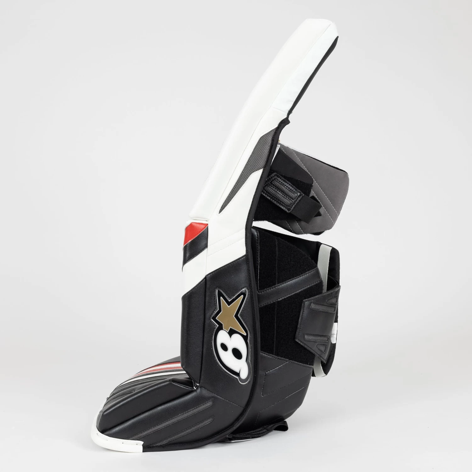 Brian’s leg pads stick with an 80° toe taper in the X5 for smooth transitions and pushes without the pad accidentally getting in the way. The X5 uses a fairly flat boot style for increased comfort and better affinity with your natural leg shape. The boot break is softer on these pads, so they can maneuver more with you while you play.