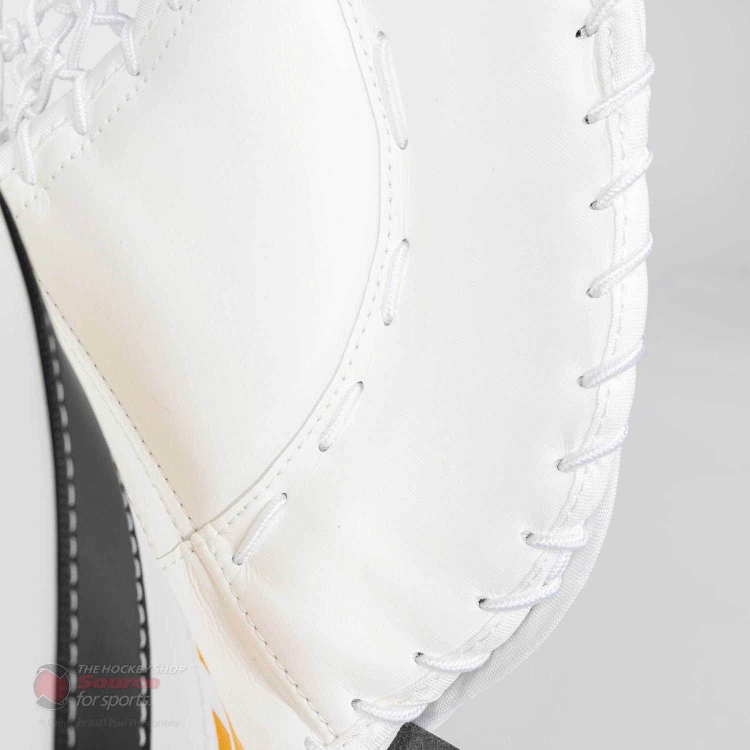 The CCM E5.9 catcher is wrapped in CCM’s proprietary SpeedSkin material. SpeedSkin on a blocker doesn’t have the same slide benefit as it does on pads. However, it is a lighter material than traditional Jenpro, and keeps the material consistent throughout a goalie’s entire setup.