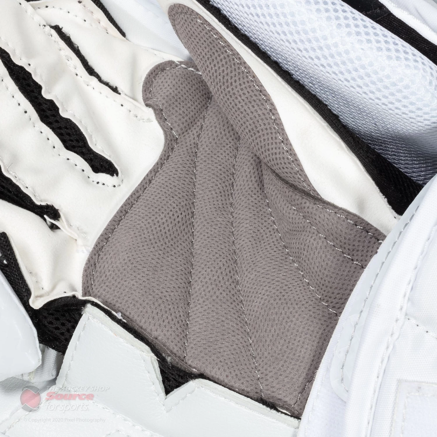 The thumb of the V9 Pro uses a moulded design in order to offer superior protection while the finger guards use a composite core and HD foams. The back of the fingers use thin HD foam padding to catch anything that passes by the large finger protectors. Finally, a large sewn in floating index finger protector sits flush with the stick to catch pucks riding up the paddle.