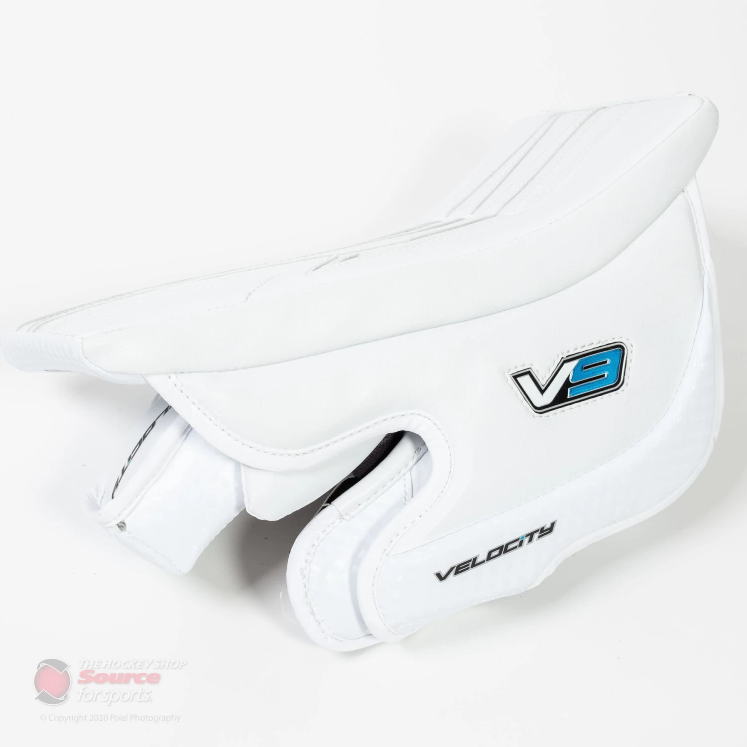 The V9 Sr blocker uses a short, floating cuff to offer increased wrist mobility. It’s velcro adjustable in order to give goalies the option to wear the cuff as tight or loose as they want while offering good protection.
